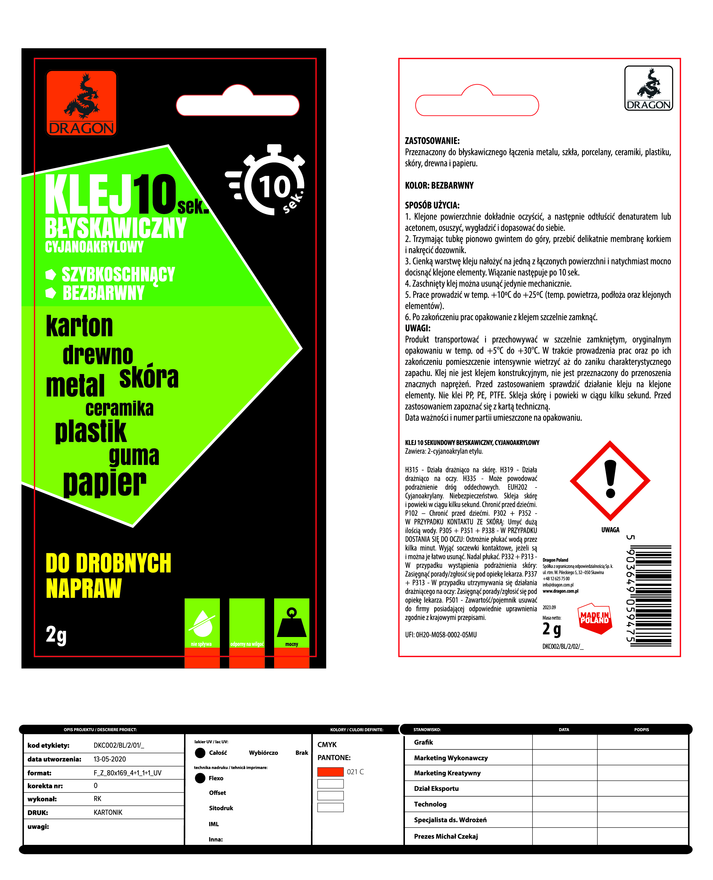 Błyskawiczny w działaniu klej na bazie cyjanoakrylanów. Charakteryzuje się szerokim spektrum działania i łatwością w aplikacji. Tworzy bezbarwną, wodoodporną i nieelastyczną spoinę. Sposób użycia: 1. Przygotowanie powierzchni: Klejone powierzchnie należy oczyścić, odtłuścić ("Denaturatem" DRAGON lub "Acetonem" DRAGON), osuszyć i wygładzić. Łączone elementy powinny być dobrze dopasowane do siebie. 2. Temperatura podczas wykonywania prac: Prace prowadzić w temp. od +10°C do +25°C (temp. powietrza, podłoża oraz klejonych elementów). 3. Zalecenia: Przytrzymując tubkę pionowo gwintem do góry, delikatnie przebić membranę korkiem i nakręcić dozownik. Kropelkę kleju rozprowadzić na jedną z łączonych powierzchni i natychmiast docisnąć drugą. Sklejenie następuje w ciągu 10 sekund.