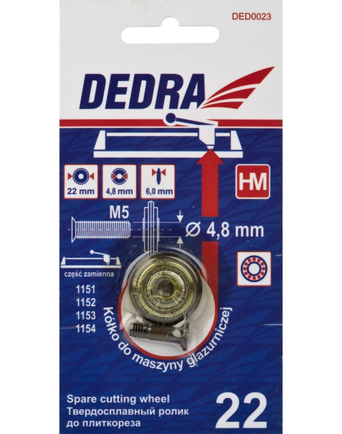 Wytrzymałe kółko tnące do maszyny glazurniczej 22/6 mm od znanego i cenionego producenta Dedra, który oferuje najwyższej jakości narzędzia glazurnicze.