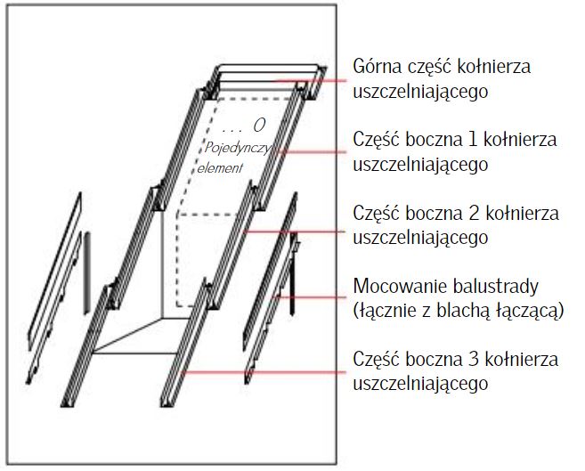 Kołnierze uszczelniające do balkonu w dachu. Kołnierze uszczelniające tego typu różnią się od wszystkich pozostałych kołnierzy uszczelniających tym, że części boczne nie są jednolite, tylko składają się z 3 wsuwanych elementów.