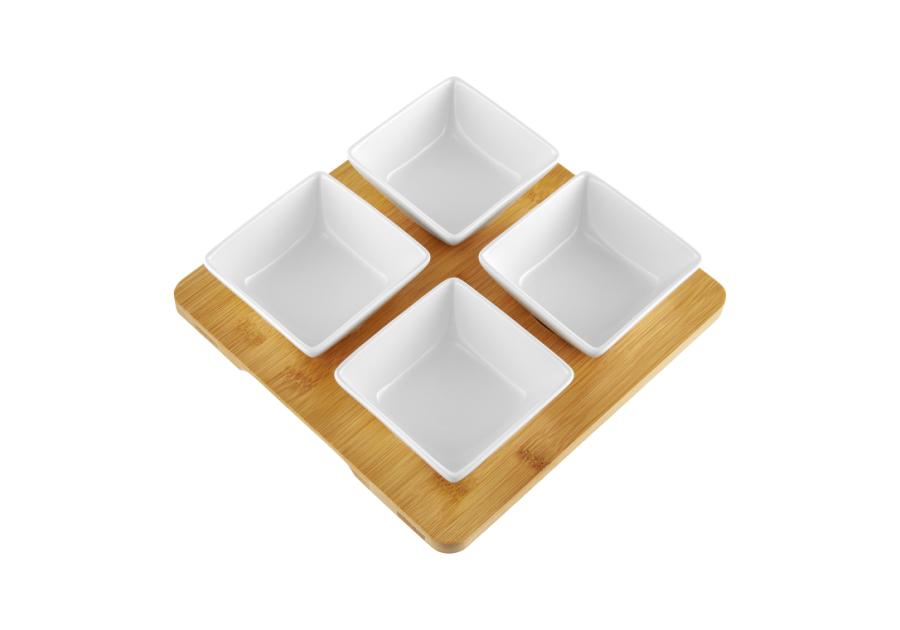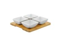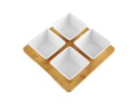 Kwadratowy komplet 4 salaterek charakteryzujący się połączeniem czystej bieli porcelany z ciepłym materiałem bambusowym: