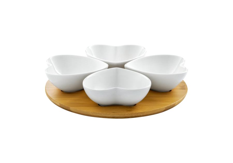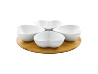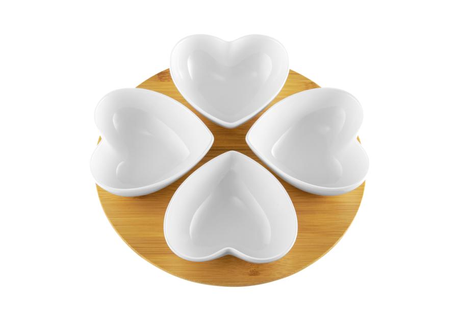 Komplet 4 salaterek na podstawie bambusowej Natural serce marki AMBITION jest niezwykle funkcjonalny i nowoczesny. Miseczki w kształcie serca wykonane są z wysokiej jakości porcelany, podstawa natomiast z trwałego i naturalnego drewna bambusowego. Wycięcia na palce w podstawie ułatwiają przenoszenie. Oryginalne zestawy miseczek i akcesoriów na bambusowej podstawie pięknie prezentują się na stole. Są idealne do serwowania przystawek oraz przekąsek. Salaterki na podstawie bambusowej pasują do każdej zastawy stołowej. Można je użyć w domu podczas codziennych posiłków, jak i serwując przekąski na wystawnych przyjęciach. Zapakowane w eleganckie pudełka są dobrym pomysłem na prezent.