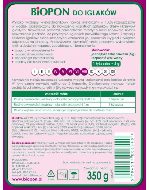 Koncentrat rozpuszczalny do iglaków BIOPON charakteryzuje się wysoką wydajnością, jedno opakowanie wystarcza bowiem na sporządzenie 350 l gotowego nawozu. Bardzo dobrze rozpuszcza się w wodzie, zapewniając tym samym wysoką przyswajalność. Produkt może być stosowany zarówno do już rosnących roślin, jak też w czasie przesadzania.