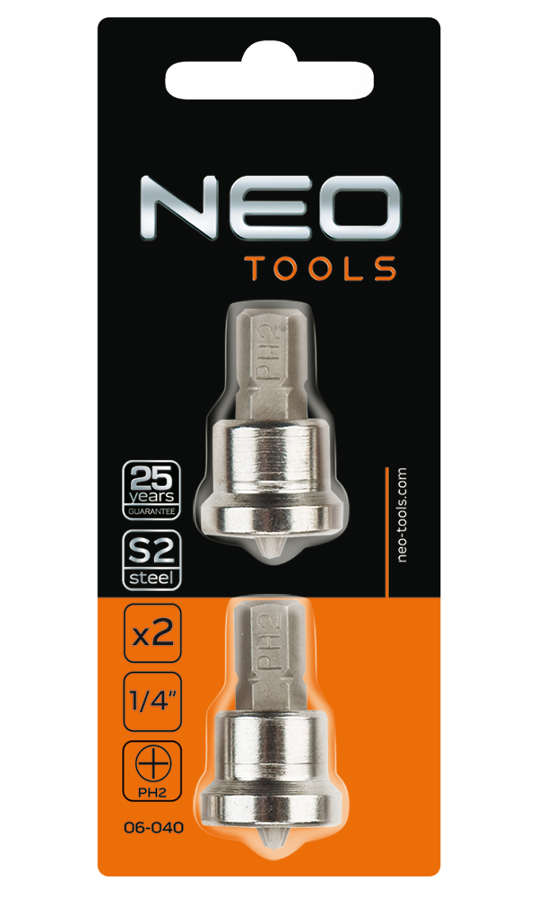 Końcówki wkrętakowe PH2 NEO (nr ref. 06-040) do płyt kartonowo-gipsowych, 1/4", o długości 25 mm, 2 sztuki w zestawie. Dzięki zastosowaniu stali stopowej S2 twardość końcówek wynosi 60 HRC, co wydatnie wydłuża trwałość i jakość ich pracy. 25-letnia gwarancja producenta potwierdza wysoką jakość narzędzi. Marka NEO spełnia oczekiwania profesjonalistów.