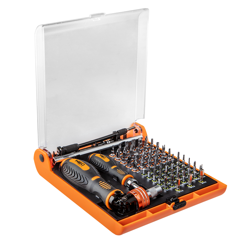 Końcówki wkrętakowe z uchwytem 73 szt. NEO (nr ref 06-115) zestaw 30 końcówek wkrętakowych oraz 31 końcówek wkrętakowych precyzyjnych wykonanych z wysokiej jakości stali chromowo-wanadowej, zapewniającej długą żywotność narzędzi. Ergonomiczne rękojeści pokryte antypoślizgowym materiałem zapewniają wysoki komfort użytkowania. Zastosowany mechanizm grzechotki w uchwycie pozwala oszczędzić czas podczas pracy. Dodatkowo w komplecie znajdują się trzy przedłużki elastyczna i dwie twarde, które skutecznie ułatwią prace. NEO spełnia oczekiwania profesjonalistów.