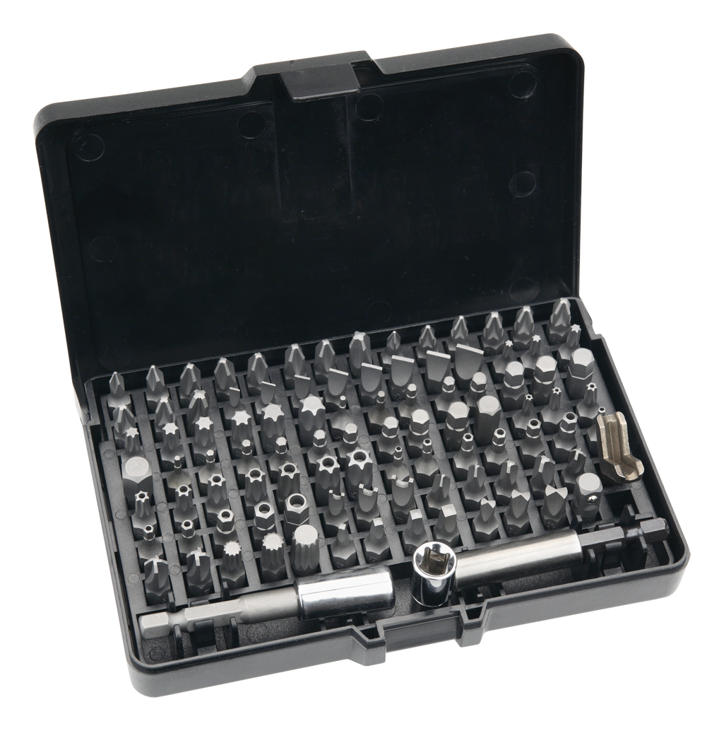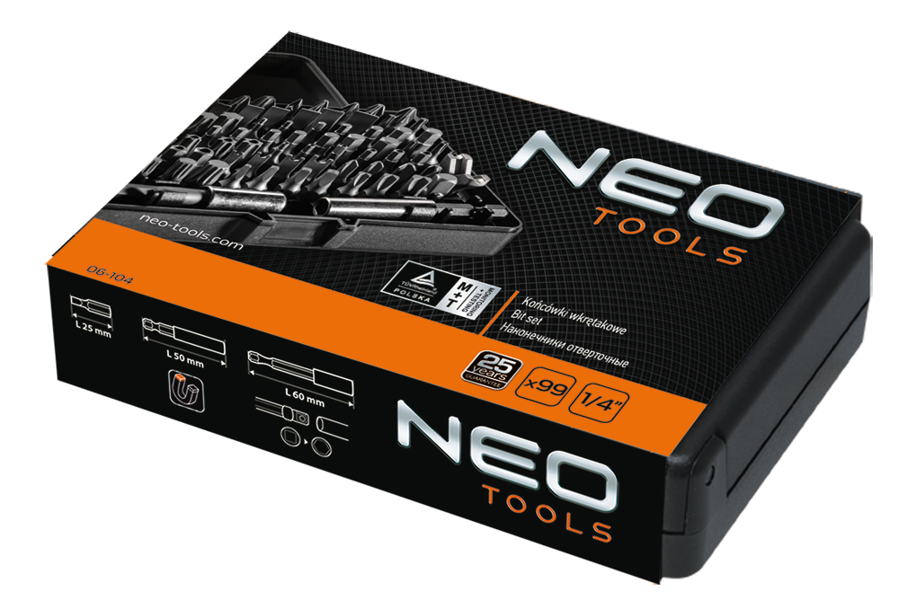 Zestaw końcówek wkrętakowych NEO (nr ref. 06-104) 1/4", składający się z 99 elementów. Dzięki zastosowaniu stali stopowej S2 twardość końcówek wynosi 60 HRC, co wydatnie poprawia trwałość i jakość ich pracy. Zestaw zawiera bogaty pakiet standardowych i specjalistycznych typów końcówek o długości 25 mm. Uzupełnieniem zestawu są adaptery do końcówek i uchwyt do haków. Gwarantem wysokiej jakości i niezawodności produktu jest certyfikat TÜV Rheinland. Marka NEO spełnia oczekiwania profesjonalistów.