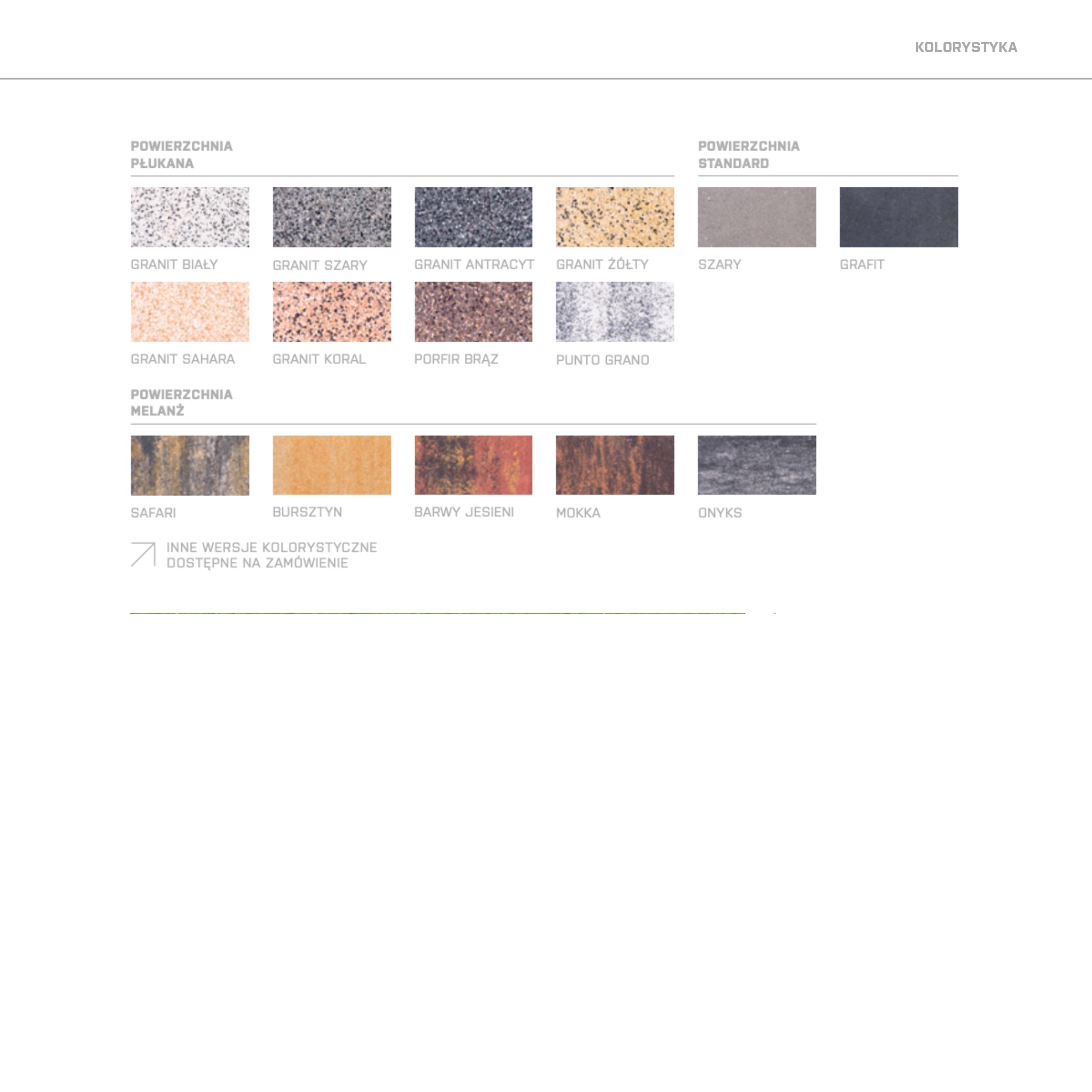 To system składający się z czterech stosunkowo niewielkich prostokątnych formatów tworzących nawierzchnię w wyważonym, eleganckim stylu./ Dostępne powierzchnie : / pow. płukana : granit biały, granit szary, granit antracyt, granit żółty, granit sahara, granit koral, porfir brąz, punto grano / pow. melanż : safari, bursztyn, barwy jesieni, mokka, onyks / pow. standard : szary, grafit