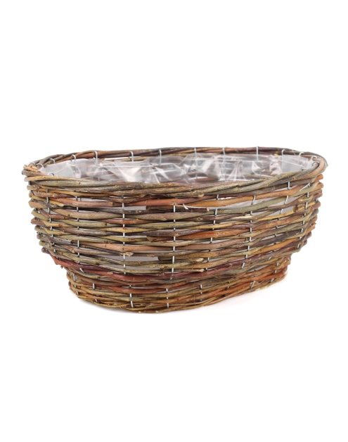 OWALNY KOSZYK WIKLINOWY Z FOLIĄ DO OBSADZANIA 35x29x14 cm Kosze wiklinowe dodadzą niepowtarzalnego uroku zarówno wnętrzu Twojego domu, jak i zagwarantuje niecodzienny wygląd w słoneczne i ciepłe miesiące Twojemu balkonowi. Kosz możesz wykorzystać jako osłonę na kwiaty albo bezpośrednio obsadzić go roślinami. Nie ma żadnych obaw przed zniszczeniem, ponieważ transparentna folia, którą obszyto środek kosza, zabezpiecza go przed wysypaniem ziemi i zabrudzeniem oraz ewentualnym wylaniem nadmiaru wody po podlaniu roślin. Obsadzony ulubionymi kwiatami kosz stworzy piękną i naturalną dekorację, obok której nikt nie przejdzie obojętnie! Wymiary*: długość: 35 cm szerokość: 29 cm wysokość: 14 cm Cechy produktu: wykonanie z naturalnego surowca: wikliny kolor: odcienie brązu wyłożone folią przeznaczenie: do domu i ogrodu * wymiary mogą się nieznacznie różnić od podanych ze względu na ręczne wykonanie z naturalnego materiału