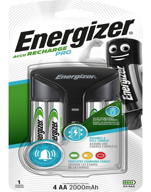 Ładowarka Energizer? Intelligent ładuje dwa lub cztery akumulatory AA lub AAA w czasie od 3 do 6 godzin. Jest zasilana z gniazda sieciowego i dzięki wbudowanej ochronie przed przeładowaniem maksymalizuje liczbę cykli ładowania chroniąc ładowarkę przed uszkodzeniem. Posiada certyfikat Energy Star.