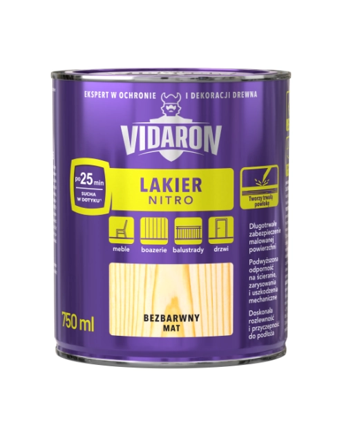 Lakier Nitro marki VIDARON to szybkoschnący, suchy w dotyku po 25 minutach lakier nawierzchniowy odporny na ścieranie, zarysowania i uszkodzenia mechaniczne. Długotrwale zabezpiecza drewniane i drewnopochodne powierzchnie drzwi, mebli, boazerii czy balustrad użytkowanych wewnątrz pomieszczeń. Lakier Nitro tworzy trwałą powłokę odporną na ścieranie, zarysowania i uszkodzenia mechaniczne. Jest łatwy w aplikacji, charakteryzuje się doskonała rozlewnością i przyczepnością do podłoża. Może być stosowany na powierzchnie metalowe.
