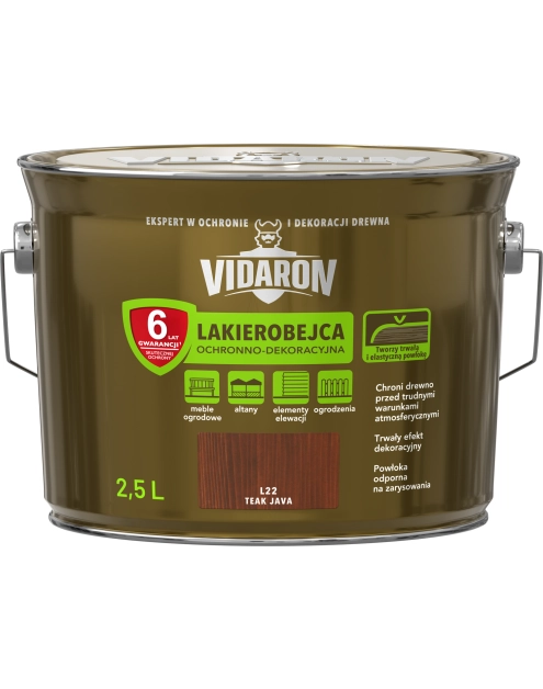 Lakierobejca VIDARON służy do ochrony i dekoracji powierzchni drewnianych użytkowanych wewnątrz i na zewnątrz. Tworzy gładką, trwałą i elastyczną powłokę, która jest odporna na zarysowania, a jednocześnie podkreśla naturalny rysunek drewna. VIDARON Lakierobejca Ochronno-Dekoracyjna to skuteczna ochrona drewna przed trudnymi warunkami atmosferycznymi, promieniowaniem UV, deszczem i śniegiem, a pomalowane altany, elementy elewacji drewnianych, meble ogrodowe, ogrodzenia na długo pozostają jak nowe.