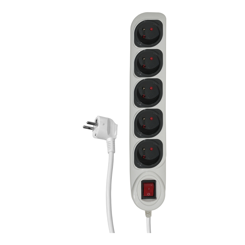 Listwa ochronna zasilająca. 5 gniazd z uziemieniem. Wyłącznik zasilania. Ochrona przed przepięciem. Napięcie znamionowe: AC 230 V ~ 50 Hz. Maksymalne obciążenie: 16 A (3680 W). Długość przewodu: 3 m. Rodzaj przewodu: H05VV-F 3G1mm2. Kolor biało-szary.