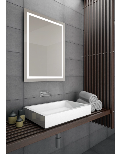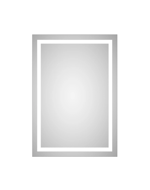 Lustro w kształcie prostokąta. Szlifowane krawędzie. Wymatowany obwodowo pasek podświetlono diodami LED. Lustro można powiesić poziomo lub pionowo. Obudowa Hicover. IP 55.