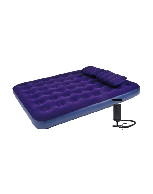 Materac nadmuchiwany flokowany z pompką ręczną i poduszkami w zestawie, wymiary: 203x152x22cm, wierzchnia warstwa pokryta welurem zapobiega zsuwaniu się pościeli, można używać zarówno w domu jak i na campingu