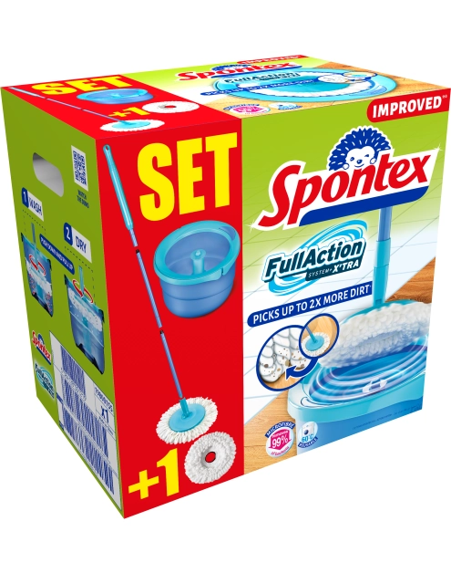 Full Action Compact + Xtra Mop obrotowy - mop z obrotowym systemem wyciskającym uruchamianym za pomocą uchwytu na kiju - kompaktowy zestaw - niewielkie okrągłe wiadro z jednolitą komorą działającą na dwóch poziomach: - dół - płukanie mopa - góra - osuszanie mopa - 2x okrągła nakładka z mikrofibry w zestawie - czyści 2x więcej zabrudzeń* (* vs Full Action System+) -mop usuwa 99% bakterii - szybko i efektywnie, bez zamaczania rąk!