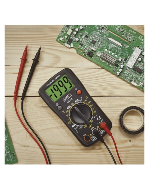 Napięcie AC: 200-300 V, napięcie DC: 200 mV - 300 V, natężenie DC: 20 mA - 10 A, wyświetlacz: 3,5 digit, podświetlenie wyświetlacza, wybór zakresu: ręcznie, rezystancja elektryczna: 200 Ohm - 2 MOhm, ciągłość obwodów, test diód, test baterii, pamięć zmierzonej wartości, wskaźnik rozładowania baterii, w zestawie: baterie, instrukcja, groty pomiarowe, zasilanie: 1x 9 V (w zestawie), wymiary: 150 x 75 x 35 mm, opakowanie: 1 szt., blister, okres gwarancyjny: 2 lata