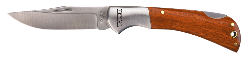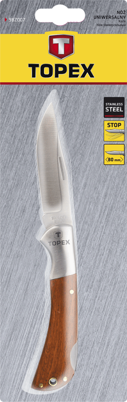 Nóż uniwersalny TOPEX (nr ref. 98Z007) o długości ostrza 80 mm. Korpus oraz ostrze wykonane z wysokiej jakości stali nierdzewnej, co gwarantuje długą żywotność narzędzia. Blokada ostrza zapewnia bezpieczeństwo podczas użytkowania. Dzięki drewnianym okładkom o ergonomicznym kształcie podniesiony jest komfort pracy. Możliwość złożenia ułatwia przechowywanie i transport. Marka TOPEX skierowana jest do majsterkowiczów.