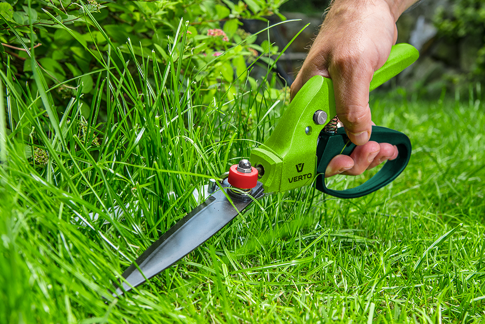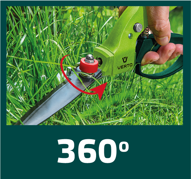 Nożyce do trawy wielopozycyjne VERTO (nr ref. 15G300) o długości 340 mm. Ostrze o długości 130 mm pokryte powłoką teflonową, zapewniającą ochronę przed korozją. Możliwość obrotu głowicy w zakresie 360° znacznie usprawnia pracę. Ergonomiczne uchwyty oraz osłona na palce zapewniają wygodę i bezpieczeństwo podczas użytkowania.
