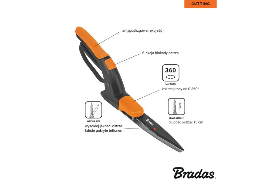 Wysokiej jakości ostrze faliste pokryte teflonem, funkcja blokady ostrza, zakres pracy od 0 do 360°, antypoślizgowa rękojeść, dł. ostrza 13cm. Idealne do precyzyjnego cięcia brzegów trawnika