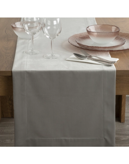 Obrus Melinda 40 x 140 cm Srebrny - Bieżnik welwetowy o subtelnym, srebrnym odcieniu, wykonany z poliestru. Doskonały wybór na eleganckie stoły, dodaje wnętrzu blasku i stylu.
