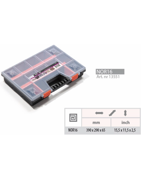 Uniwersalny organizer z serii Nor o regulowanych przegródkach, których wielkość i ilość można łatwo dostosować do własnych potrzeb. Transparentna pokrywa pozwala bez otwierania sprawdzić, co jest w środku, a dzięki mocnej rączce organizer można bez trudu przenieść w inne miejsce. Maksymalna ilość przegródek w tym modelu: 15 szt.