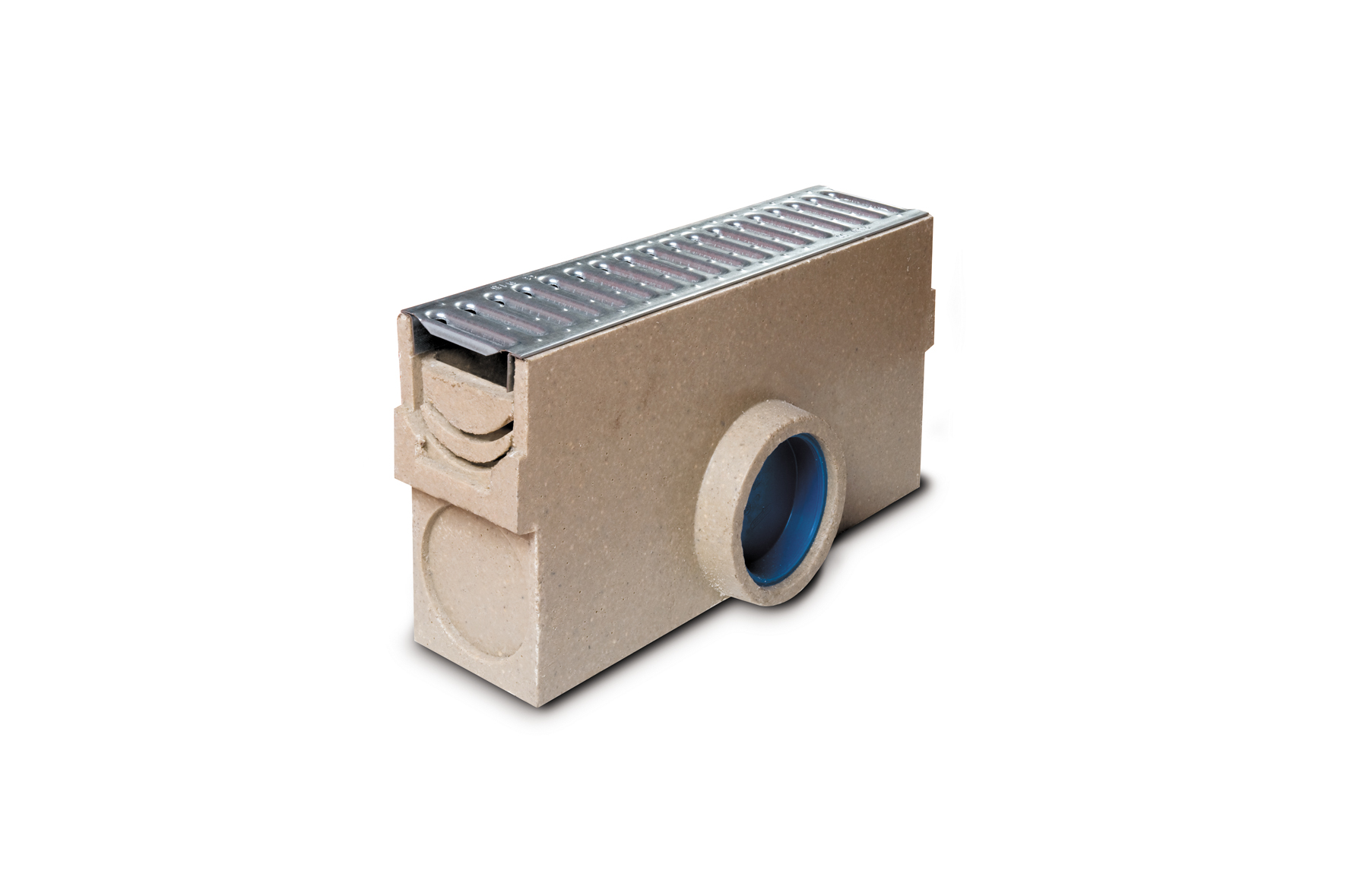 Osadnik piasku pasujący do kanałów z polimerobetonu o wysokościach 60, 80, 100, 120 oraz 195 mm z kratą żeliwną o klasie obciążenia B125 (12,5 tony).
