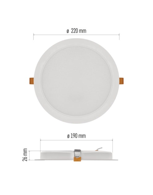 Źródło światła: LED, moc: 24 W, odpowiednik oprawy: 145 W, stopień ochrony: IP20, strumień świetlny: 2 400 lm, temperatura barwowa: 4 000 K, barwa światła: neutralna biel, kształt: koło, materiał obudowy: tworzywo (PC), materiał osłony: tworzywo (PC), typ klosza: mleczny, indeks oddawania barw (CRI): Ra > 80, kąt świecenia: 120 st., sposób montażu: wpuszczana, wymiary: średnica 220 x 26 mm, otwór montażowy: 190-210 mm, kolor obudowy: biały, częstotliwość: 50/60 Hz, napięcie: 220-240 V, pojemność: 209 mA, rodzaj: RUBIC, okres gwarancyjny: 2 lata, opakowanie: 1 szt., pudełko, żywotność: 25 000 godzin, współczynnik mocy: > 0,7, skuteczność świetlna: 100 lm/W, LGP materiał: nie dotyczy, prąd wyjściowy ze źródła: 50 mA