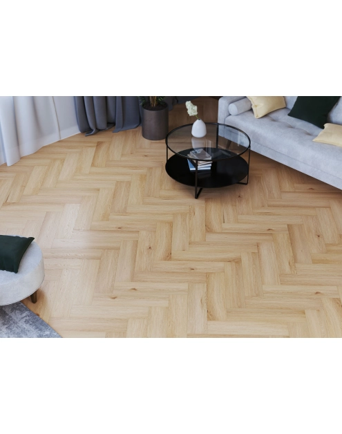 Subtelna elegancja i klasyka w jodełce Panel winylowy Afirmax LEGNAR HERRINGBONE Dąb Arvada to idealne połączenie jasnych, naturalnych odcieni drewna z ponadczasowym wzorem jodełki. Delikatne usłojenie i subtelne przejścia tonalne nadają wnętrzom lekkości i harmonii, sprawiając, że podłoga doskonale komponuje się zarówno z nowoczesnymi, jak i klasycznymi aranżacjami. Dzięki wodoodpornej konstrukcji panele świetnie sprawdzają się w każdym pomieszczeniu, w tym w kuchniach i łazienkach. Stabilny rdzeń mineralny zapewnia trwałość i odporność na odkształcenia, a warstwa użytkowa 0,55 mm gwarantuje wysoką odporność na codzienne użytkowanie. Grubość 4,5 mm oraz kompatybilność z ogrzewaniem podłogowym sprawiają, że Dąb Arvada to doskonały wybór dla osób poszukujących eleganckiej, a zarazem funkcjonalnej podłogi w układzie jodełkowym. To połączenie naturalnego piękna drewna z nowoczesną trwałością i komfortem użytkowania.