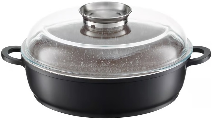 Patelnia głęboka z powłoką nieprzywierającą Qualum Basic Stone Edition Arras 28 cm marki AMBITION jest solidna i trwała, a jej stylowy design sprawia, że będzie świetnie prezentować się na każdej kuchennej półce. Patelnia marki AMBITION to idealne rozwiązanie dla osób, które cenią sobie wygodę i funkcjonalność podczas gotowania. Wykonana z odlewanego aluminium co gwarantuje długotrwałe zachowanie pierwotnego kształtu. Patelnia nie deformuje się pod wpływem temperatury, a dno nie ulega odkształceniu. Doskonale przewodzi ciepło, dzięki czemu oszczędzamy czas i pieniądze. Wewnątrz pokryta powłoką nieprzywierającą Qualum Basic Stone Edition, imitującą kamień, natomiast od zewnątrz jest w kolorze czarni. Posiada pokrywkę z dozownikiem w gałce do uzupełniania płynów tzw. Aroma Knob System. Umożliwia on uzupełnianie płynów podczas pieczenia czy gotowania bez konieczności podnoszenia pokrywy. Dużym atutem jest to, że patelnia nadaje się do zmywarki, co ułatwia czyszczenia. Przystosowana jest do używania na wszystkich typach kuchenek oraz piekarnika do temperatury 220stopni C.