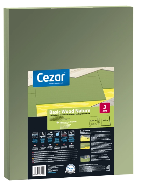 Podkład podłogowy Basic Wood Nature CEZAR to naturalny podkład pod podłogi pływające (tj. panele laminowane, deska trójwarstwowa) wykonany z drewna sosnowego poprzez spilśnienie jego włókien. Podkład pod panele ma zdolność tłumienia drgań, wyrównuje podłoże oraz redukuje skrzypienie podłogi. Produkt dostępny w grubościach 3, 4, 5 i 7 mm. Podkład Basic Wood Nature został wyprodukowany w technologii przyjaznej dla środowiska. Do utworzenia dodatkowej izolacji paroszczelnej polecane jest użycie folii paroizolacyjnej Cezar Basic Izopar.