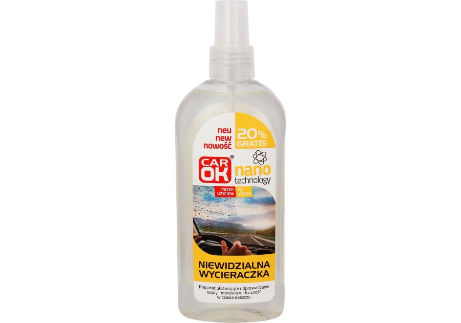 Nowatorski środek ułatwiający odprowadzanie wody z szyby. W preparacie marki CAR OK wykorzystano technologię nanocząsteczek, które tworzą na powierzchni szyby specjalną, nieprzemakalną powłokę. Niewidzialna wycieraczka to środek: