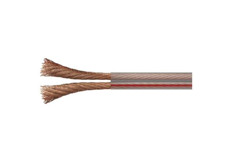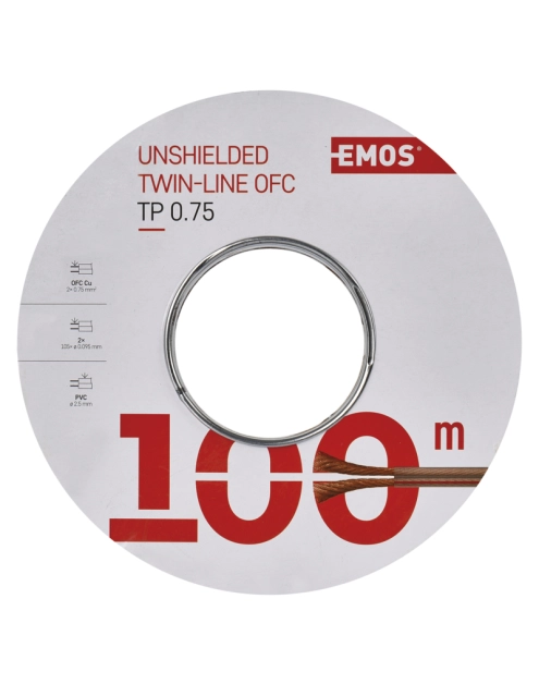 Okres gwarancyjny: 5 lat, typ: SP075/TP, materiał żyły wewnętrznej: OFC miedź (Cu), przekrój przewodów: 0,75 mm2, średnica żyły wewnętrznej: 105x 0,095 mm, izolacja zewnętrzna: 2x 2,5 mm, kolor płaszcza: przezroczysty, przezroczysty, materiał izolacji: PVC, maksymalne napięcie pracy: 50 V, zastosowanie: podłączenie głośników, sposób pakowania - długość: 100 m, opakowanie: 100 m, szpula