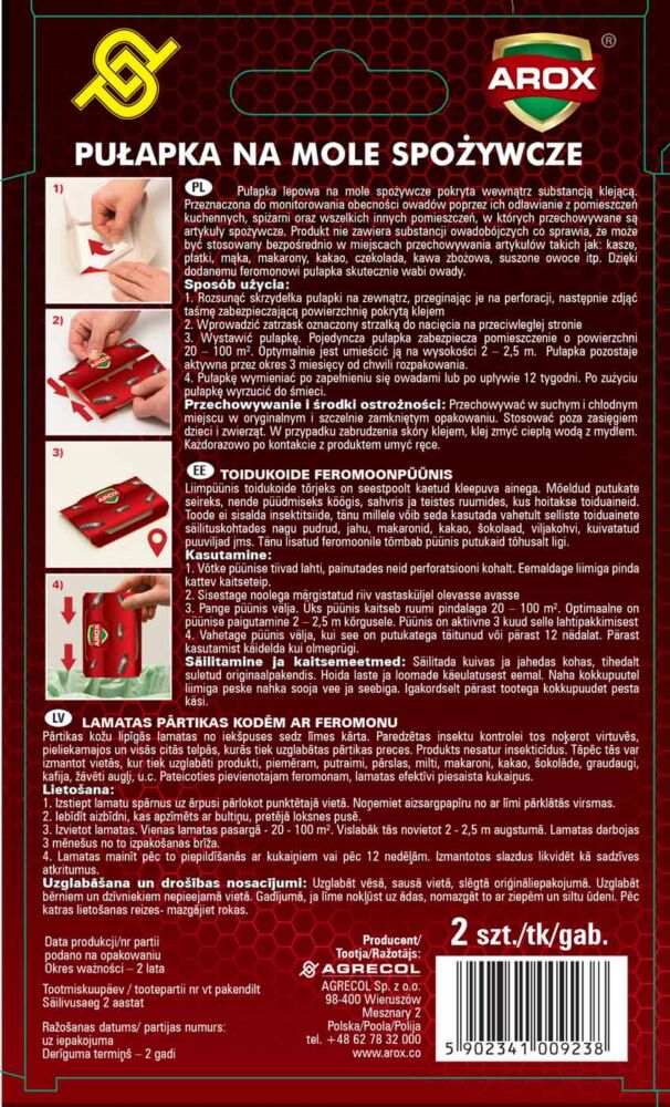 Pułapka lepowa na mole spożywcze pokryta wewnątrz substancją klejącą. Przeznaczona do monitorowania obecności owadów poprzez ich odławianie z pomieszczeń kuchennych, spiżarni oraz wszelkich innych pomieszczeń, w których przechowywane są artykuły spożywcze. Produkt nie zawiera substancji owadobójczych co sprawia, że może być stosowany bezpośrednio w miejscach przechowywania artykułów takich jak: kasze, płatki, mąka, makarony, kakao, czekolada, kawa zbożowa, suszone owoce itp. Dzięki dodanemu feromonowi pułapka skutecznie wabi owady. Sposób stosowania Rozsunąć skrzydełka pułapki na zewnątrz, przeginając je na perforacji, następnie zdjąć taśmę zabezpieczającą powierzchnię pokrytą klejem Wprowadzić zatrzask oznaczony strzałką do nacięcia na przeciwległej stronie Wystawić pułapkę. Pojedyncza pułapka zabezpiecza pomieszczenie o powierzchni 20 – 100 m2. Optymalnie jest umieścić ją na wysokości 2 – 2,5 m. Pułapka pozostaje aktywna przez okres 3 miesięcy od chwili rozpakowania. Pułapkę wymieniać po zapełnieniu się owadami lub po upływie 12 tygodni. Po zużyciu pułapkę wyrzucić do śmieci.
