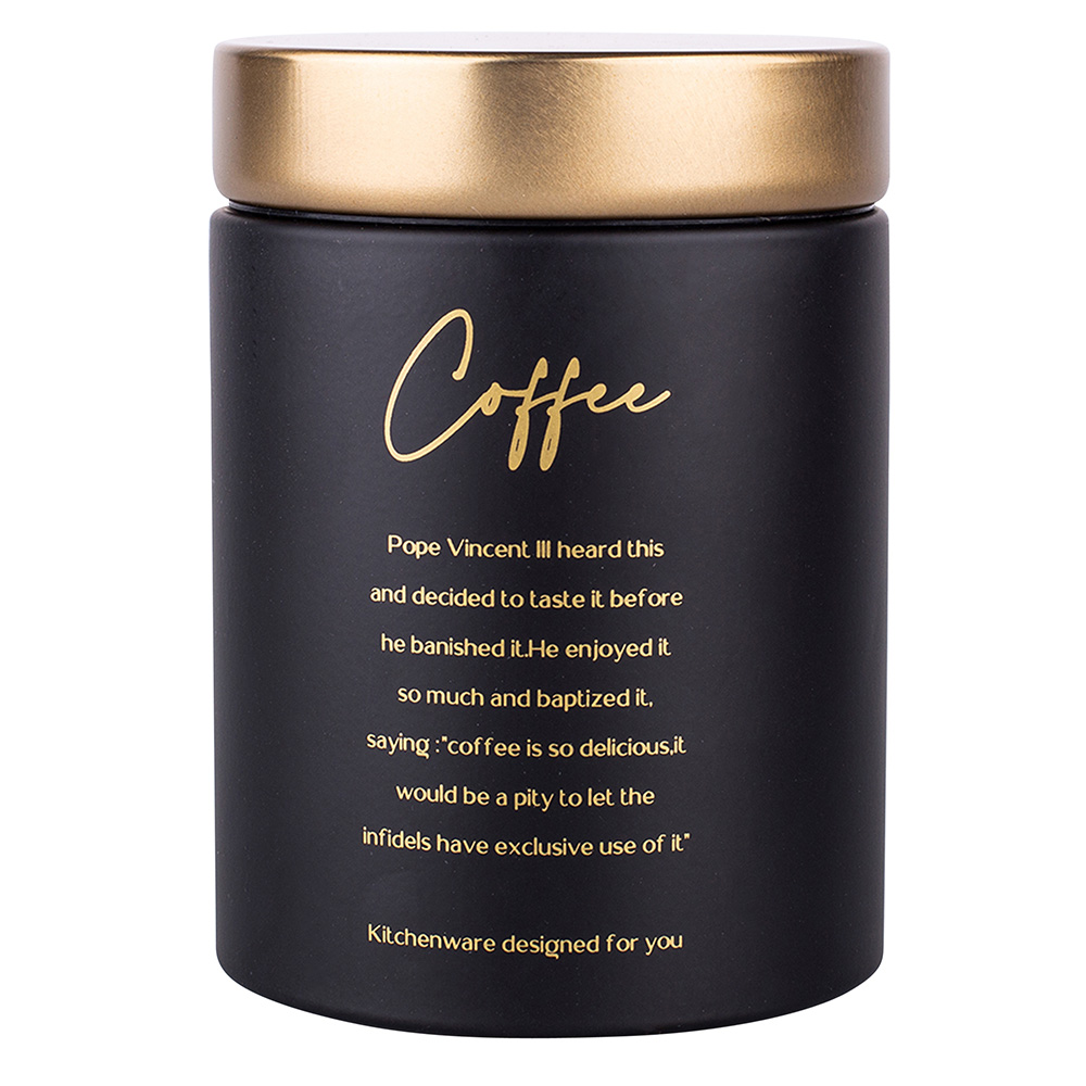 Puszka okrągła czarna matowa z pokrywką w odcieniu złota Coffee Altom to doskonały wybór do każdej kuchni. Przeznaczona jest do przechowywania kawy, jak wskazuje napis na niej umieszczony.