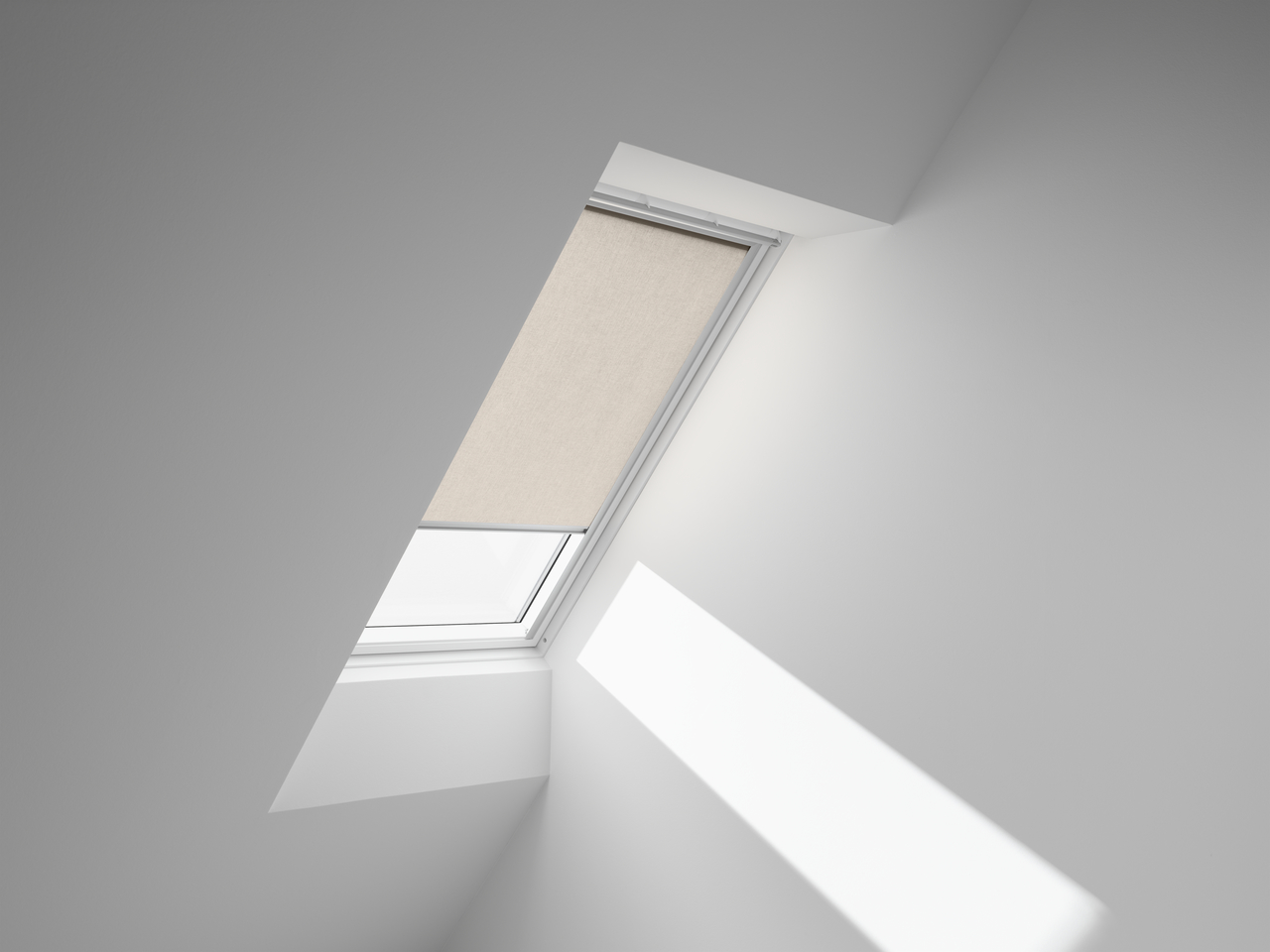 Roleta dekoracyjna VELUX umożliwia kontrolę nad ilością i natężeniem światła słonecznego wpadającego do wnętrza. Bezstopniowa regulacja polega na uniesieniu lub opuszczeniu rolety w celu dostosowania ilości światła do osobistych preferencji lub wymagań dotyczących prywatności w tych pomieszczeniach, których zaciemnianie nie jest konieczne.