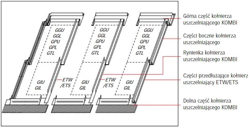 ETW WK34 0000F jest to rynienka kołnierza uszczelniającego potrzebna do połączenia KOMBI z dodatkowymi elementami doświetlającymi GIL lub GIU. Do standardowych kołnierzy uszczelniających jest ona niezbędna do kazdej przestrzeni pomiędzy oknami. Szerokość wynienki wynosi 12 cm.