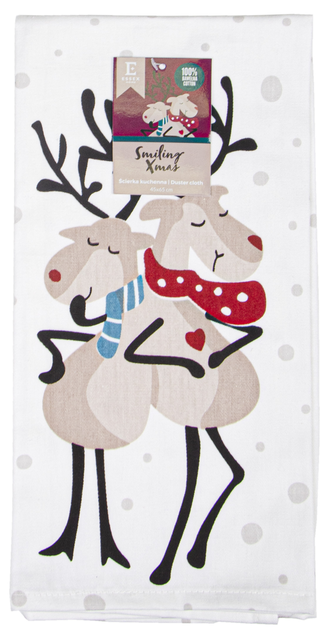 Ozdabiając swój dom na święta, należy zadbać o każdy detal. Ścierki, ręczniki kuchenne czy rękawice są oczywiście praktycznym elementem codziennego kuchennego życia, ale świetnie spiszą się też w roli bożonarodzeniowej ozdoby. Przepiękna ścierka Smiling Xmas świetnie dopasuje się w każde wnętrze. Jej bazę stanowi uniwersalny delikatny kolor, dzięki czemu doskonale wpisze się we wszystkie minimalistyczne aranżacje. Uroczy wzór reniferów wpływa natomiast na jej niebanalny wygląd. Ścierka posiada następującą specyfikację: