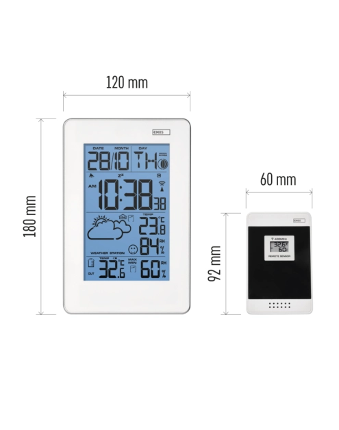 zegar: DCF (zegar sterowany sygnałem radiowym), wykonanie termometru: bezprzewodowe, podświetlenie LED wyświetlacza: tak, 12/24 godzinny format czasu: tak, strefy czasowe: tak, data: tak, kalendarz: tak, budzik: tak, powtarzane budzenie: tak, temperatura zewnętrzna: -50 °C do +70 °C, rozdzielczość 0,1 °C, temperatura wewnętrzna: -10 °C do +50 °C, rozdzielczość 0,1 °C, wilgotność zewnętrzna: 20 % do 95 %, rozdzielczość 1 %, wilgotność wewnętrzna: 20 % do 95 %, rozdzielczość 1 %, min. i maks. temperatura: tak, jednostki temperatury: °C/°F, prognoza pogody: tak, ostrzeżenie temperaturowe: tak, trend temperatury: tak, fazy Księżyca: tak, zasięg czujnika: do 30 m, dodatkowe czujniki: 3 (E05018), zasilanie czujnika: 2× 1,5 V AAA (brak w zestawie), częstotliwość: 433 MHz, zasilanie stacji: 3× 1,5 V AA (brak w zestawie), wymiary głównej jednostki (wys. × sz. × gł.): 50 × 120 × 180 mm, wymiary czujnika (wys. × sz. × gł.): 23 × 60 × 92 mm, wymiary wyświetlacza (wys. × sz.): 80 × 120 mm, opakowanie: 1 szt., pudełko, klasa energetyczna: nie dotyczy, okres gwarancyjny: 2 lata