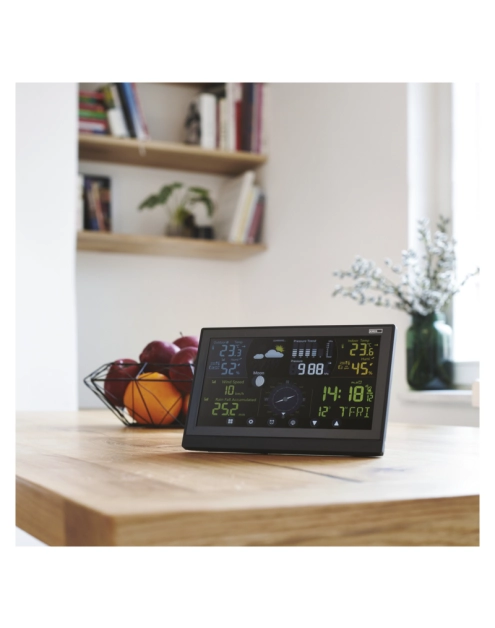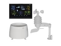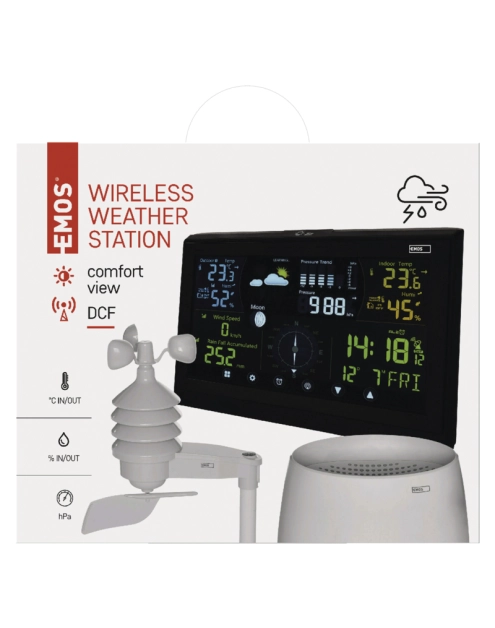 Zegar: DCF (sterowany sygnałem radiowym), wykonanie termometru: bezprzewodowe, podświetlenie LED wyświetlacza, możliwość zawieszenia na ścianie, podświetlenie wyświetlacza, ciągłe podświetlenie, 12/24 godzinny format czasu, strefy czasowe, data, kalendarz, budzik: tak, 2x, powtarzane budzenie, temperatura zewnętrzna: -30 st.C do +60 st.C, rozdzielczość 0,1 st.C, temperatura wewnętrzna: -10 st.C do +50 st.C, rozdzielczość 0,1 st.C, wilgotność zewnętrzna: 1 % do 90 % RH, rozdzielczość 1 %, wilgotność wewnętrzna: 1 % do 99 % RH, rozdzielczość 1 %, min. i maks. temperatura, jednostki temperatury: st.C/ st.F, prognoza pogody, ostrzeżenie temperaturowe, trend temperatury, trend ciśnienia, barometr, deszczomierz, wiatromierz, ustawianie wysokości nad poziomem morza, fazy Księżyca, zasięg czujnika: do 100 m, dodatkowe czujniki: 3 (E06018), 1 (E06016), zasilanie czujnika: 4x 1,5 V AA (brak w zestawie), częstotliwość: 433 MHz, zasilanie jedn. głównej: 3x1,5 V AAA(brak w zestawie), zasilacz sieciowy: tak, 5 V DC/300 mA (w zestawie), wymiary głównej jednostki: 17 x 192 x 127 mm, wymiary czujnika: 250 x 160 x 100 mm, wymiary wyświetlacza: 168 x 93 mm, opakowanie: 1 szt., pudełko, okres gwarancyjny: 2 lata