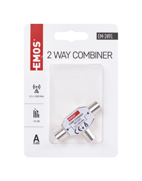 Produkt: zwrotnica SAT+TV, rodzaj: uniwersalny ferrytowy, ilość wejść: 2, ilość wyjść: 1, typ złącz: IEC, zakres częstotliwości: 0,1-1 000 MHz, tłumienie przejścia sygnału: 3,5 dB, przejście dla prądu stałego (power pass), materiał obudowy: odlew cynkowy, temperatura pracy: -10 do +65 st.C, zastosowanie: TV + R, stopień ochrony: IP20, wymiary: 17 x 32 x 23 mm, opakowanie: 1 szt., woreczek PVC, okres gwarancyjny: 2 lata