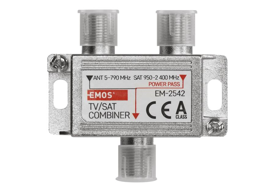 Produkt: zwrotnica SAT+TV, rodzaj: uniwersalny ferrytowy, ilość wejść: 2, ilość wyjść: 1, przeznaczone do łączenia sygnałów satelitarnych, typ złącz: złącze F, zakres częstotliwości: 5-2 400 MHz, tłumienie przejścia sygnału: 3,5 dB, przejście dla prądu stałego (power pass): tak, SAT, materiał obudowy: odlew cynkowy, temperatura pracy: -10 do +65 st.C, zastosowanie: TV + R + SAT, stopień ochrony: IP53, wymiary: 25 x 35 x 20 mm, opakowanie: 1 szt., woreczek PVC, okres gwarancyjny: 2 lata
