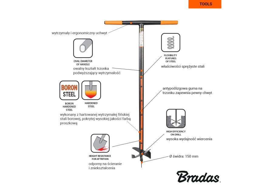 Świder z hartowaną głowicą ze stali borowej, średnica 15 cm BRADAS