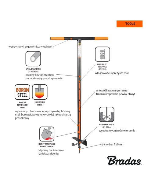 Doskonały do przygotowania otworów przeznaczonych do sadzenia drzewek oraz wiercenia otworów na słupki ogrodzeniowe. Antyposlizgowa guma na trzonku, wytrzymały, pokryty wysokiej jakości farbą proszkową.