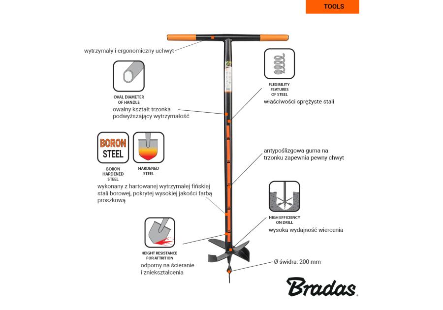 Świder z hartowaną głowicą ze stali borowej, średnica 20 cm BRADAS