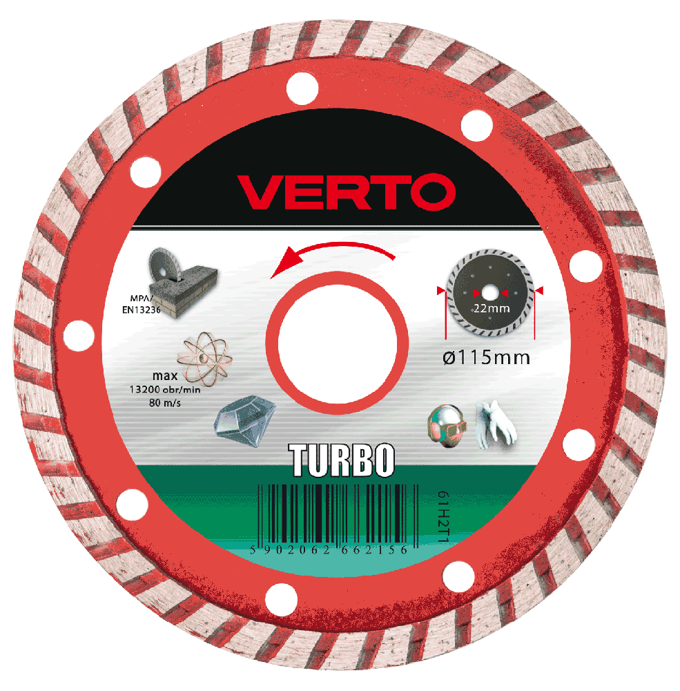 Tarcza diamentowa turbo VERTO (nr ref. 61H2T1) o średnicy zewnętrznej 115 mm pozwala wydajnie ciąć elementy wykonane z betonu, betonu zbrojonego, granitu, marmuru, kamienia, cegły itp. Marka VERTO oferuje asortyment elektronarzędzi i akcesoriów dla każdego majsterkowicza.
