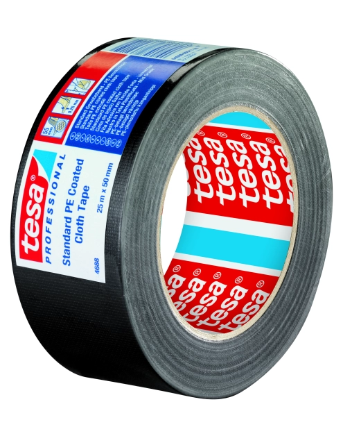 Standardowa taśma tkaninowa tesa 4688 posiada nośnik powleczony polietylenem i masę klejącą z kauczuku naturalnego. Kombinacja ta gwarantuje łatwość użytkowania - taśma łatwo się odwija i można ją urywać ręcznie. Taśma naprawcza jest mocna, ale także wystarczająco elastyczna, aby stanowić niezawodne wsparcie przy realizacji prac. Taśma nadaje się do wielu różnych zastosowań i cechuje ją bardzo duża przyczepność nawet do chropowatych powierzchni. Ta odporna na działanie wody i na starzenie taśma materiałowa jest dostępna w następujących siedmiu kolorach: czarny, biały, niebieski, żółty, czerwony, srebrno-matowy i zielony.