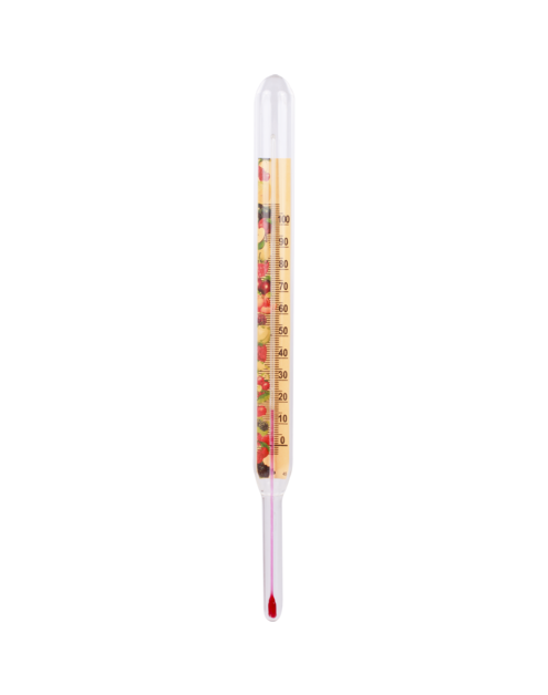 Duży, wygodny i poręczny termometr o długości 22 cm to akcesorium, którego nie może zabraknąć w Twojej kuchni! Urządzenie przeznaczone do kontroli temperatury podczas tworzenia domowych przetworów, pasteryzacji oraz parzenia wędlin ułatwi Ci codzienną pracę w kuchni! Produkt został w całości wykonany w Polsce i cechuje się wysoką jakością oraz niezawodnością. Termometr cieczowy, nie zawiera rtęci, dzięki czemu w bezpieczny i łatwy sposób możesz wykorzystywać go podczas przygotowywania posiłków bez obaw o kontakt z niebezpieczną substancją w przypadku jego stłuczenia. Wysoka jakość, klarowne szkło oraz skala od 0 do 100 stopni Celsjusza pozwoli Ci na precyzyjne określenie temperatury. Dodatkowo kolorowa, czytelna skala z owocowym motywem ułatwi dokonanie odczytu pomiaru w każdych warunkach. Produkt jest niezwykle łatwy w konserwacji i czyszczeniu — wystarczy go umyć w ciepłej, bieżącej wodzie. Uwaga! Termometr nie nadaje się do mycia w zmywarce! Dokładność urządzenia +/- 1 st. C.