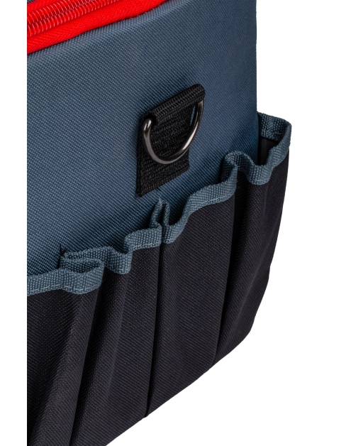 Torba jest niezwykle wytrzymała, ponieważ wykonano ją z wysokiej jakości materiału o gęstym splocie i posiada dużą pojemność (24 l). Jest odporna na przecieranie i chroni zawartość przed wilgocią oraz czynnikami zewnętrznymi. Posiada aż 14 kieszeni zewnętrznych, 7 wewnętrznych oraz 14 zaczepów na narzędzia. Dzięki odpowiednim wymiarom możesz przenosić do czterech elektronarzędzi wraz z osprzętem. Co więcej, torba, dzięki wygodnemu uchwytowi, zapewni Ci maksymalny komfort.