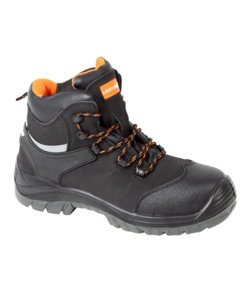 MATERIAŁ: Wierzch: skóra nubukowa, zewnętrzna konstrukcja obuwia w części bocznej i tylnej wzmocniona tworzywem TPR. Podszewka: dzianina siatkowa. Wyściółka: wymienna. Podeszwa: poliuretan dwugęstościowy o właściwościach antypoślizgowych (podłoże ceramiczne), odporna na olej napędowy, głęboki protektor zapewnia wysoką stabilność obuwia. KAT. BEZPIECZEŃSTWA: S3 SRA. Podnosek kompozytowy. Polimerowa wkładka antyprzebiciowa. Właściwości antyelektrostatyczne. Absorpcja energii w części piętowej. Zabudowana pięt.a Ograniczona przepuszczalność i absorpcja wody. Elementy odblaskowe. Obuwie nie zawiera elementów metalowych. NORMA: ISO 20345:2011.