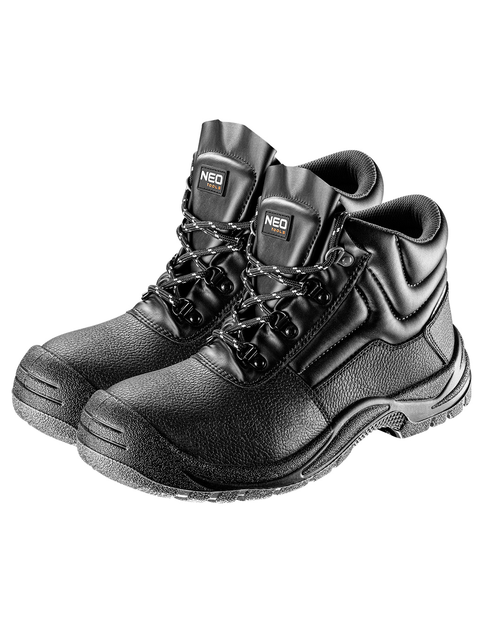 Trzewiki zawodowe 82-770 NEO ze skóry bydlęcej klasy O2 SRC chronią stopę przed chłodem, przemiękaniem i nasiąkaniem wodą. Buty posiadają siatkowe wykończenie wewnętrzne oraz elementy odblaskowe zapewniając lepszą widoczność użytkownikowi. Buty są wygodne i trwałe dzięki sztywnej i zabudowanej pięcie oraz metalowym szlufkom.