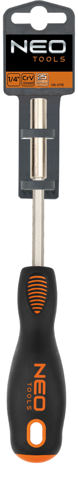 Uchwyt do końcówek 1/4" NEO (nr ref. 06-078) o długości grota 100 mm. Grot wykonany jest z wytrzymałej stali chromowo-wanadowej. Uchwyt posiada magnetyczną końcówkę. Trójgraniasty kształt rękojeści z wyprofilowanym oparciem dla kciuka zmniejsza obciążenie dłoni podczas pracy i ułatwia uzyskanie optymalnego momentu obrotowego. Niezawodność produktu potwierdza 25-letnia gwarancja. Marka NEO spełnia oczekiwania profesjonalistów.